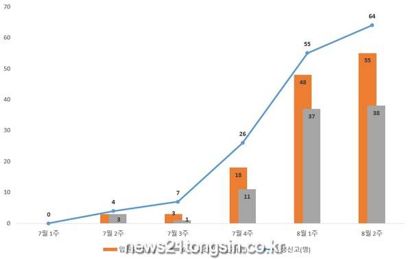 광주지역 200병상 병원급 표본감시기관(5개소)의 8월 2주 입원환자는 55명으로, 4주전 3명에 비해 18배 늘었다.