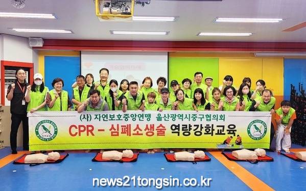 (뉴스21통신/우정석기자) = (사)자연보호중앙연맹 울산중구협의회(회장 최병호)는 2024년 8월16일(금) 울산 중구 반구동 소재 나토얀태권도장에서 회원 및 청소년 30여명을 대상으로 심폐소생술 교육을 가졌다.