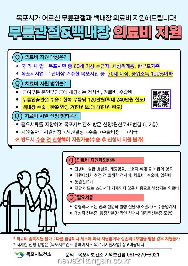 [뉴스21통신 박민창기자] 목포시가 올해 처음 시행 중인 '목포시 노인 무릎인공관절 수술 및 백내장 수술 의료비 지원사업'이 시민들로부터 큰 호응을 얻고 있다.