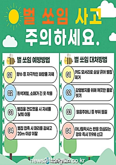 최근 들어 여름휴가철로 야외활동이 왕성한 시기이며, 보건소 및 의료기관 내원 응급환자의 벌쏘임 방문이 급격히 증가함에 따라 군민들의 인명피해 예방을 위한 적절한 예방조치가 필요한 상황이다.