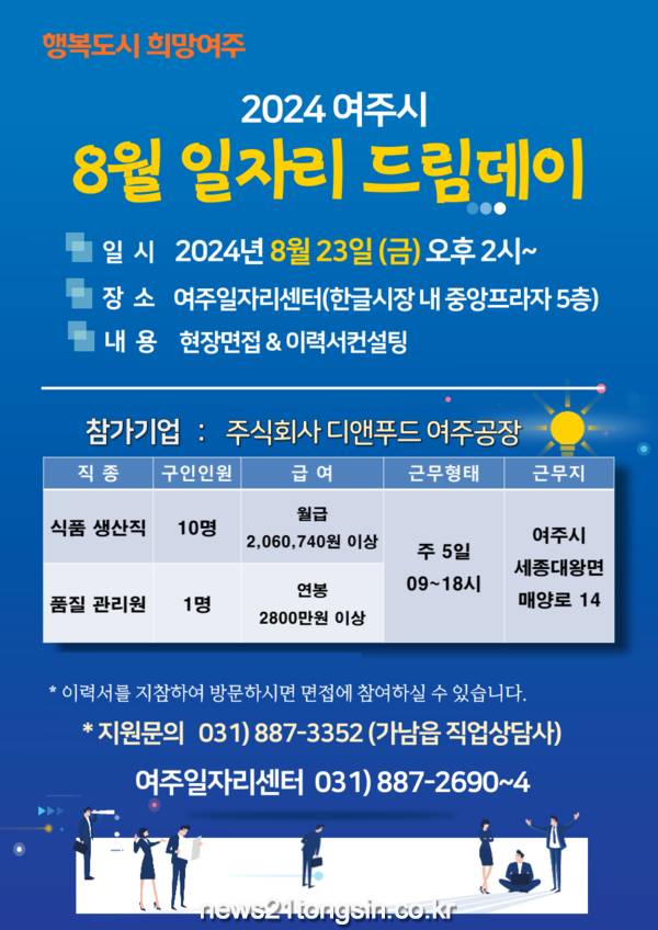 8월 일자리드림데이 구인업체는 세종대왕면 소재의 주식회사 디앤푸드 여주공장으로 식품 생산직 10명, 품질 관리원 1명을 모집한다.