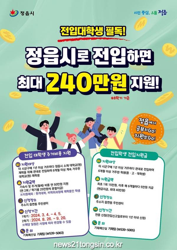 전북특별자치도 정읍시는 오는 26일부터 9월 20일까지, 2024년 하반기 전입 대학생 주거비용 지원사업의 접수를 시작한다고 20일 밝혔다.