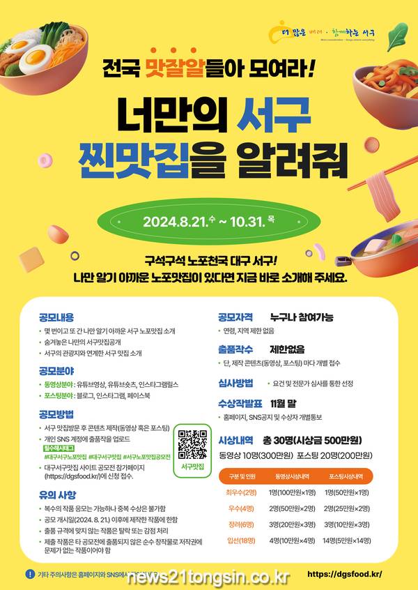 (뉴스21통신) 최우성기자 = 대구 서구(구청장 류한국)는 「너만의 서구 찐맛집을 알려줘!」를 주제로 이번 달 21일부터 10월 31일까지‘노포 맛집 SNS 콘텐츠 공모전’을 개최한다고 밝혔다.