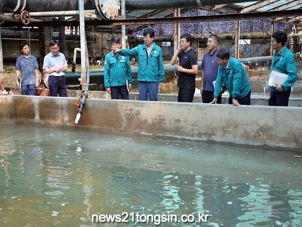 장흥군은 14일 득량만 해역 고수온 발생으로 인한 넙치(12,000마리) 폐사 현장 방문을 실시했다고 밝혔다.김성 군수는 양식 어업인을 직접 만나 격려하고 2차 피해를 최소화하기 위해 행정력을 총동원하겠다고 밝혔다.아울러 적조 주의보 상향 발표에 따른 적조 발생 현장을 방문하여 피해가 발생하지 않도록 사전 점검을 철저히 실시하도록 당부했다.올해는 유난히 짧은 장마와 바다 수온이 빠르게 오르는 기상변화로 득량만 해역은 7월 24일부터 수온 28℃가 넘는 고수온 주의보 발효됐다.조기출하로 고수온을 피해 갈 수 있었으나, 안타깝게도 경기 불황으로 출하가 늦어져, 성어인(2kg 이상) 넙치 12,000마리가 폐사됐다.피해액은 3억 8천만 원으로 추산되나, 재해보험에 가입되어 있어 피해 규모를 다소 덜 수 있을 것으로 전망된다.김성 군수는 “사료 급이 중단, 액화산소 공급, 산소 발생기 가동 등 다양한 방법을 현장에 적용해 고수온 피해를 최소화해야 한다. 다른 양식 어가에게도 관련 내용을 적극 홍보해 가겠다”라고 말했다.이어 지난 8월 2일부터 적조가 발생된 관산읍 장환리 바다를 현장 점검하면서, 적조로 인한 피해가 발생하지 않도록 42개 어촌계 어민들에게 충분히 홍보하고 적조발생 대비에 만전을 기하도록 당부하였다.이번 현장 방문에는 김성 장흥 군수와 전창우 전라남도 친환경 수산과장이 함께 했다.전남도 관계자는 “양식 어가의 또 다른 피해가 발생하지 않도록 적극 노력하겠다”라며, “적조 또한 지속적인 예찰과 신속한 대처를 통해 어민 피해 최소화해 전라남도가 앞장서겠다”라고 밝혔다.