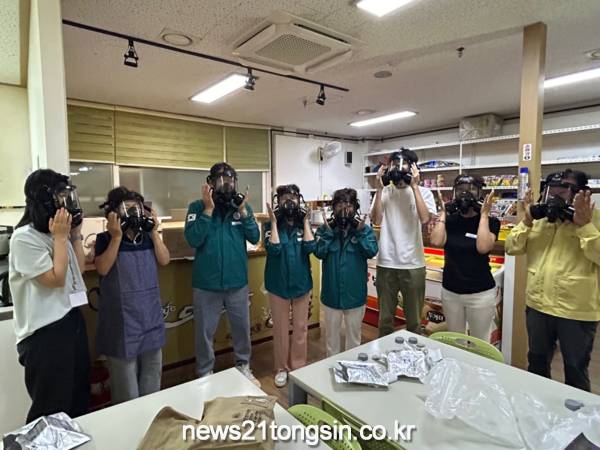 (뉴스21통신/우정석기자) = 울산동부도서관(관장 김숙현)은 지난 22일 도서관 대피소에서 이용자들이 참여한 가운데 방독면 착용 훈련을 했다.