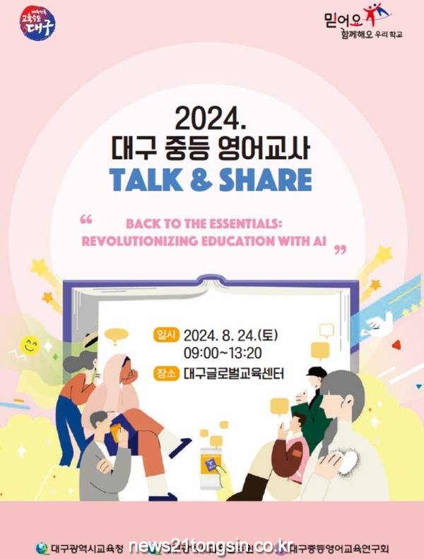 (뉴스21통신) 최우성기자 = 대구시교육청(교육감 강은희)은 8월 24일(토) 9시부터 대구글로벌교육센터에서 ‘2024. 대구 중등 영어교사 수업 나눔(Talk & Share)’행사를 개최한다.