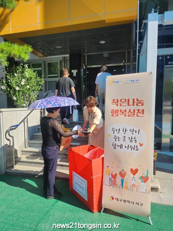 (뉴스21통신) 최우성기자 = 대구 서구청(구청장 류한국)은 각종 행사 등에서 기념품으로 받은 뒤 보관만 하는 새 수건을 기부받아 작은 나눔을 전하는 “수건 모아 나눔 실천 운동”을 추진하고 있다.