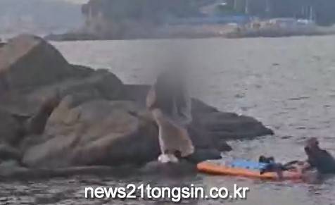 갯바위 위에 한 여성이 서 있고, 여성을 향해 구조대원들이 다가간다.