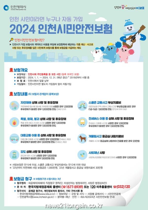 인천광역시가 인천시민안전보험에 대한 시민 설문조사 결과를 발표했다.이번 조사는 매년 운영 중인 시민안전보험에 대한 시민들의 인식과 요구사항을 파악하기 위해 진행됐다. 주요 조사 항목으로는 ▲시민안전보험의 인지도와 인지 경로 ▲보장항목 우선순위 ▲추가 보장항목 및 보장금액 등에 대한 의견이 포함됐다.설문조사 결과, 응답자의 90.7%가 시민안전보험의 ‘정책 필요성’에 공감했으며, 89.1%가 ‘시민보호에 도움’이 된다고 긍정적으로 평가해, 시민안전보험에 대해 높은 만족도를 나타냈다.시민들이 가장 도움이 된다고 생각하는 보장항목으로는 ‘대중교통 이용 중 상해 사망 및 후유장해’가 63.9%로 가장 많이 꼽혔으며, 그 뒤를 이어 ‘폭발, 화재, 붕괴 상해 사망 및 후유장해’(52.5%)와 ‘자연재해 상해 사망 및 후유장해’(30.5%) 순으로 조사됐다(복수응답).시민안전보험의 인지도를 묻는 질문에는 82.9%가 보험을 알고 있다고 응답했다. 이들 중 61.8%는 ‘시청 홈페이지, 블로그, 인스타그램 등 SNS’를 통해 보험을 알게 되었다고 답했으며, ‘구청 및 행정복지센터 방문 시 안내’(14.3%)와 ‘TV 자막방송, 라디오 등 방송매체’(8%)가 그 뒤를 이었다.또한, 현재 운영 중인 안전보험에 대한 개선 의견도 제시됐다. 시민들은 ‘사회재난 상해 후유장해’와 ‘강력범죄 상해 보상금’을 추가 보장항목으로 신설할 필요가 있다고 답했으며, 응답자의 60% 이상이 현재 최대 1,300만 원인 사망 보장금액과 최대 1,500만 원인 후유장해 보장금액을 2,000만 원 이상으로 상향 조정하는 것이 적절하다고 응답했다.인천시는 이번 설문조사 결과를 바탕으로 보장금액 상향 조정, 보장항목 추가 등 시민안전보험의 확대 방안을 검토하고, 2025년부터 이를 반영할 계획이다.김성훈 시 시민안전본부장은 “시민들의 의견을 적극 반영하여 더욱 실효성 있는 시민안전보험을 운영하기 위해 노력하겠다”며 “예기치 못한 재난‧사고로 피해를 본 인천 시민들이 보험 혜택을 받을 수 있도록 홍보를 강화해 나가겠다”라고 밝혔다.인천 시민안전보험은 인천에 주민등록을 두고 거주하는 모든 시민(등록 외국인 포함)이 별도의 가입 절차 없이 자동으로 가입되며, 폭발·화재·붕괴 상해 사망 및 후유장해, 대중교통 이용 중 상해 사망 및 후유장해 등 13개 항목에 대해 보험사와의 약정 내용에 따라 최대 1,500만 원까지 보장받을 수 있다.