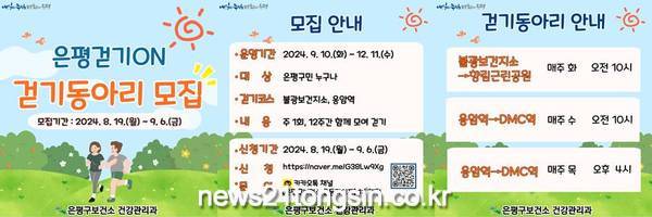 은평구(구청장 김미경)는 구민의 걷기 활성화를 위해 하반기 ‘은평걷기ON’을 운영해 걷기동아리 참가자를 내달 6일까지 모집한다고 밝혔다.