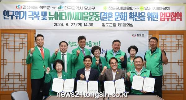 (뉴스21통신) 최우성기자 = 대구 달서구(구청장 이태훈)가 27일 청도군에서 청도군(군수 김하수)·청도군새마을회(전인주)와 초저출생 인구 위기에 공동 대응하고, 뉴(NEW)새마을운동(결혼문화) 확산 등을 위한 업무 협약을 체결했다.