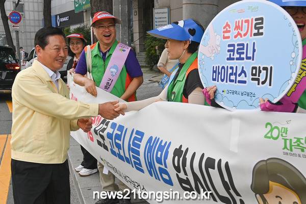 이번 캠페인은 최근 지속적으로 증가하는 코로나19 감염병 예방 수칙을 구민들에게 널리 알리고, 건강수칙 실천을 독려하기 위해 남구 새마을회, 남구 자율방재단 및 관계 공무원 등 120여 명이 참여하였다.