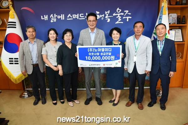 (뉴스21통신/우정석기자) = ㈜노아엘이디(대표 정양숙)가 29일 군청 군수실에서 이순걸 군수와 정양숙 대표, 사회복지공동모금회 울산지회 관계자 등이 참석한 가운데 울주군에 성금 1천만원을 전달했다.