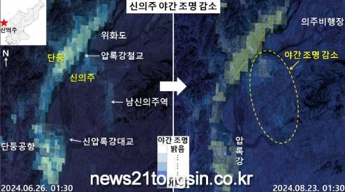 야간 조도 영상을 분석한 정성학 한국 한반도안보전략연구원 연구위원은 28일 자유아시아방송(RFA)에 신의주 일대가 어두워진 이유는 수해로 전선주나 전력시설 등이 훼손됐기 때문일 수 있다고 분석했습니다.