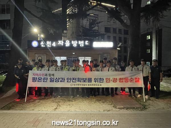 (뉴스21통신) 황태원기자 = 대구동부경찰서(서장 장호식)은 8.29.(목) 20:00, 동대구역 앞 터미널 먹거리촌 일대에서 동부서 범죄예방대응과 주관으로 대구시경찰청 기동순찰대와 신천3‧4동 자율방범대 합동으로 민‧경 합동순찰을 실시하였다.