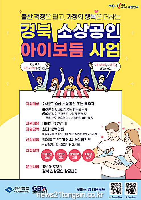 경상북도는 ‘2024년도 소상공인 출산지원 아이보듬지원사업’의 참여 대상자 신청 접수를 2일부터 시작한다.