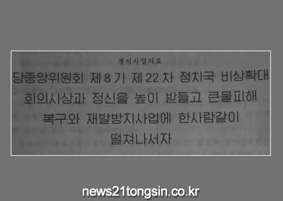 지난 7월 말 진행된 당중앙위원회 제8기 제22차 정치국 비상확대회의 이후 작성된 것으로 추정되는 해당 정치사업자료에는 북한 주민들이 수해 복구를 위해 각종 지원에 적극 나서도록 독려하라는 내용이 담겨 있습니다. 누구나 수재민에게 생활필수품을 적극 지원하고 수해복구를 위한 시멘트, 목재 등의 자재를 적극 제공하라는 내용이다.