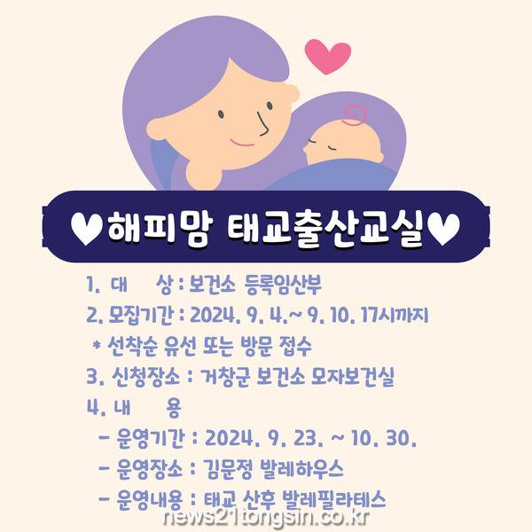 거창군은 4일부터 10일까지 임산부의 건강관리를 위한 ‘해피맘 태교·출산 교실’ 참여자 16명을 선착순으로 모집한다고 4일 전했다.