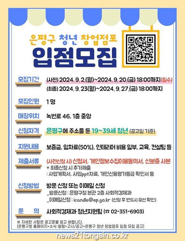 은평구(구청장 김미경)는 오는 20일까지 ‘청년 창업점포’에 입점할 청년을 모집한다고 밝혔다.