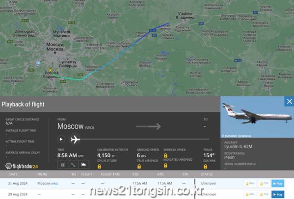 플라이트레이더24에 따르면, 고려항공 P-881기는 지난달 29일 평양에서 출발해 모스크바에 도착했고, 31일 오전 8시48분 모스크바를 떠난 것으로 나타났다.
