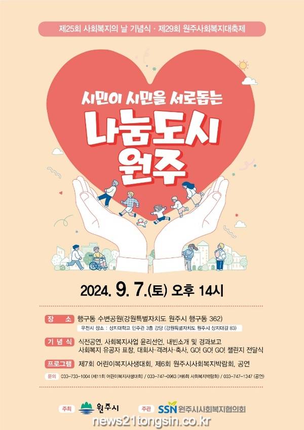□ 앞서, 지난 8월 한 달간 축제 사전 행사로 진행된 ‘걷GO!, 줍GO! 기부되GO!’ 걷기 챌린지에서는 시민 574명이 함께 145,707,780보를 달성하여 1,700만 원의 기금을 마련하는 등 축제 분위기를 달궜다.□ ‘시민이 시민을 서로 돕는 나눔도시 원주’를 주제로 오후 2시에 열리는 기념식에서는 우리 지역 곳곳에서 지역복지 발전을 위해 헌신해 온 사회복지 유공자 32명에 대한 표창패 수여식이 진행되며, 식전 행사로 초청 가수들의 축하공연도 열린다.□ 또한 행사 당일 현장에는 부대행사로 어린이복지 사생대회, 사회복지박람회 등 다양한 프로그램을 마련하여, 방문객들에게 볼거리와 즐길 거리를 제공할 예정이다.□ 원강수 원주시장은 “사회복지 현장에서 열정과 사명감으로 소임을 다하는 사회복지종사자, 자원봉사자, 수상자를 비롯한 모든 분께 감사와 축하를 드린다.”라며, “사회복지 관련 다양한 체험을 할 수 있는 즐거운 사회복지대축제가 되길 바란다.”라고 전했다.