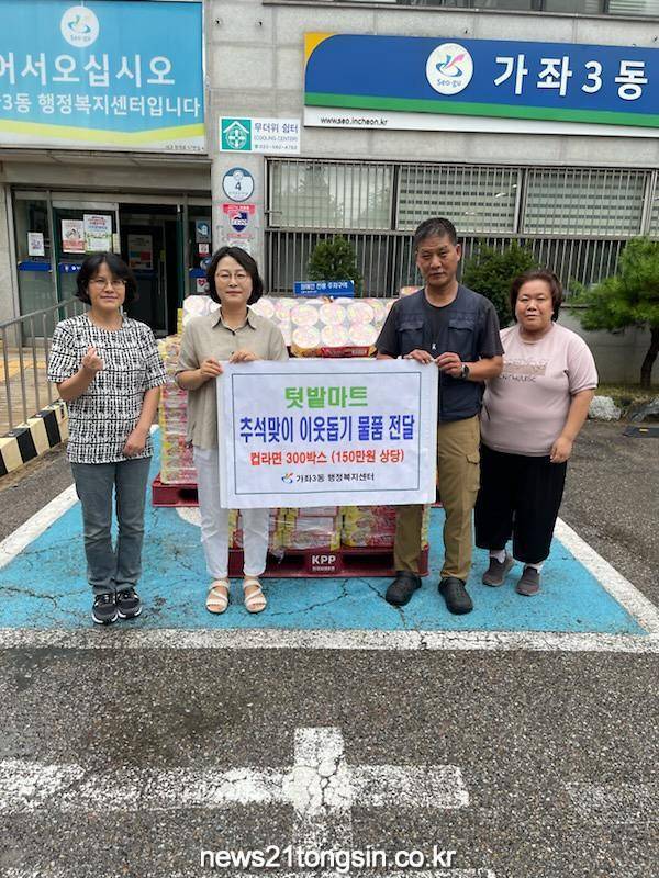 가좌3동 텃밭마트(대표 노형균)는 민족 대명절 추석을 맞아 지난 9월 5일(목) 가좌3동행정복지센터(동장 김성주)를 방문하여 추석맞이 사랑의 이웃돕기 물품(컵라면 300박스)을 전달했다.