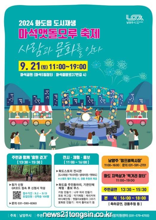 남양주시(시장 주광덕)는 오는 21일 마석공원(마석5일장터)에서 ‘2024 화도읍 도시재생 마석맷돌모루 축제’를 개최한다고 6일 밝혔다.