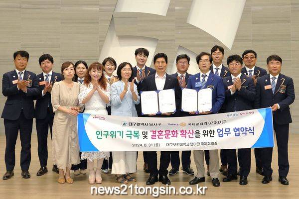 (뉴스21통신) 최우성기자 = 대구 달서구(구청장 이태훈)가 지난달 31일 대구보건대 연마관에서 국제로타리3700지구(총재 이충환)와 초저출생 인구 위기에 공동 대응하고,‘잘 만나보세’뉴(NEW)새마을운운동(결혼문화) 확산 등을 위한 업무협약을 체결했다.