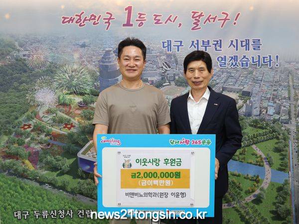 (뉴스21통신) 최우성기자 = 대구 달서구(구청장 이태훈)는 지난 2일 비앤비뇨의학과(원장 이윤형)로부터 이웃사랑 후원금 200만원을 전달받았다고 밝혔다.
