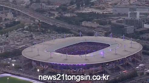 빗속에 보라빛 조명으로 빛난 프랑스 스포츠의 상징, 스타드 드 프랑스에서, 최고의 도전을 응원하는 산타의 공연으로 폐회식의 막이 올랐다.