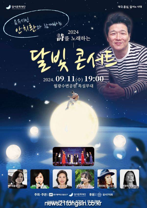 (뉴스21통신) 최우성기자 = (재)달서문화재단(이사장 이태훈)은 유난히 무덥고 힘든 올해 여름을 지나 더욱 소중하게 느껴지는 가을을 맞이하여, 자연의 정취를 담은 시를 낭송하고 한국가곡,대중가요를 들어보는 ‘2024 시(詩)를 노래하는 달빛 콘서트’를 개최한다.