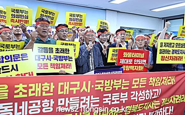 박정대 이전지원위원회 위원장은 “국토부가 의성, 군위에 똑같은 화물터미널을 만들어 동네공항으로 전락시키려 하는데 왜 경북도지사는 가만히 보고만 있는지 모르겠다”며 “적극적으로 나서지 않으면 대규모 집회를 한 판 벌이겠다”고 경고했다.