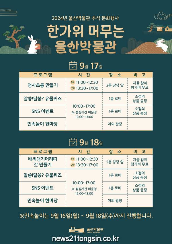 (뉴스21통신/우정석기자) = 울산박물관은 추석을 맞아 오는 9월 14일부터 9월 18일까지 울산박물관과 울산대곡박물관에서 다양한 추석 전통문화 행사를 운영한다고 밝혔다.