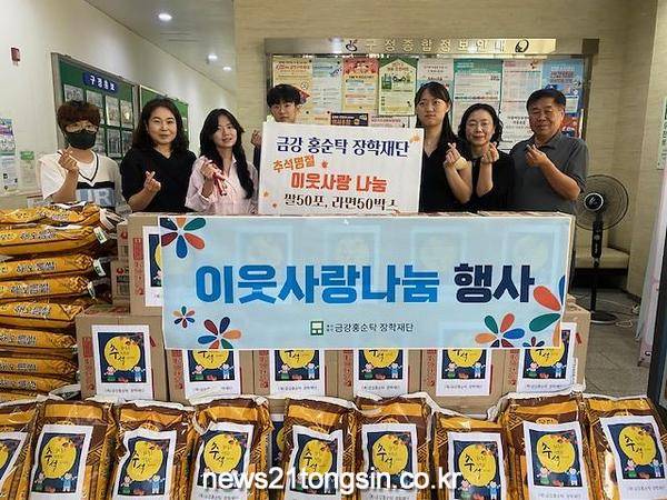 인천 서구 소재 금강 홍순탁 장학재단에서는 지난 9월 6일 다가오는 추석 명절을 맞이하여 양곡 10kg 50포와 라면 50박스를 가좌1동 지역사회보장협의체(공동위원장 김미진, 이두영)에 전달하였다.