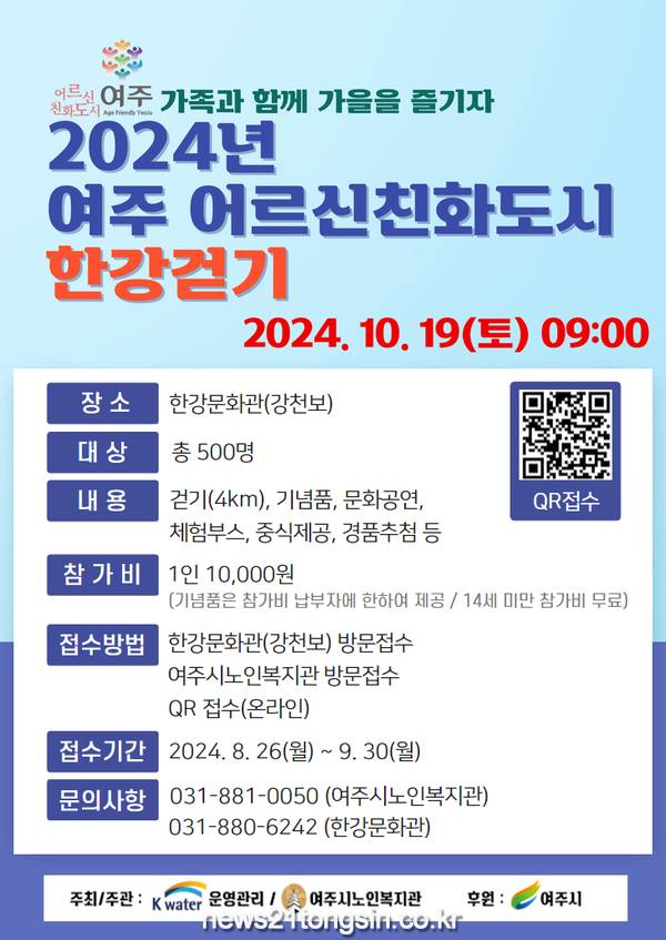 □ K-water운영관리(사장; 우달식) 한강문화관에서는 오는 10월 19일 토요일, ‘2024년 여주 어르신친화도시 한강걷기’를 개최한다고 밝혔다. 이번 행사는 여주시노인복지관(관장; 이석자)과 공동주관하며, 여주시(시장; 이충우)가 후원한다.