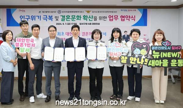(뉴스21통신) 최우성기자 = 대구 달서구(구청장 이태훈)가 지난 6일 구청 회의실에서 성서자율방범대 레이디캅스(대장 신경림)·달서소방서119시민안전봉사단(단장 배청한)과 초저출생 인구 위기에 공동 대응하고, 뉴(NEW)새마을운운동(결혼문화) 확산 등을 위한 업무 협약을 체결했다.
