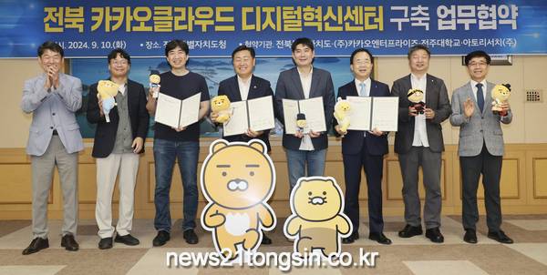 전북자치도는 10일, 김관영 도지사, 카카오엔터프라이즈 이경진 대표이사, 전주대학교 박진배 총장, 아토리서치 정재웅 대표이사가 함께 ‘전북 카카오클라우드 디지털 혁신센터 구축 및 운영에 관한 업무협약’을 체결했다고 밝혔다.