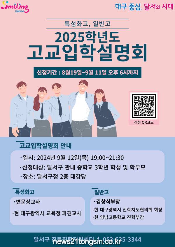 (뉴스21통신) 최우성기자 = 대구 달서구(구청장 이태훈)는 12일 19시 구청 2층 대강당에서 중학생과 학부모를 대상 2025학년도 고등학교 입시 설명회를 개최한다.