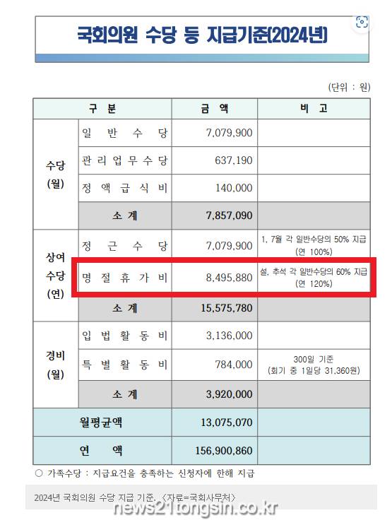 명절 휴가비 외에도 국회의원이 받는 수당은 일반수당·관리업무수당·정액급식비를 비롯해 1월과 7월에 지급되는 정근수당, 입법활동비와 특별활동비 등 다양하다.