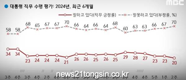 또, 직무수행 부정 평가는 3%p가 오른 70%로 나타났는데, 이 역시 취임 후 가장 높은 수치이다.