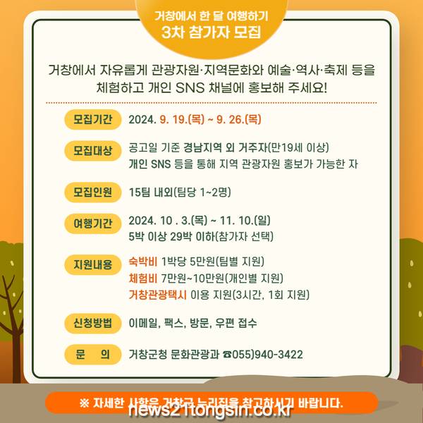 참가 자격은 만 19세 이상 경남지역 외 거주자로 1∼2명씩 팀을 이루어 참여할 수 있다. 참가자들은 거창을 여행하는 동안 거창의 다양한 관광자원을 사회적관계망서비스(SNS)를 통해 홍보하면 된다.