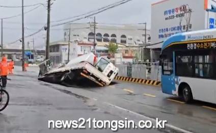 집중 호우로 대형 땅 꺼짐이 발생하며 화물차 2대가 빠졌던 사고 현장.