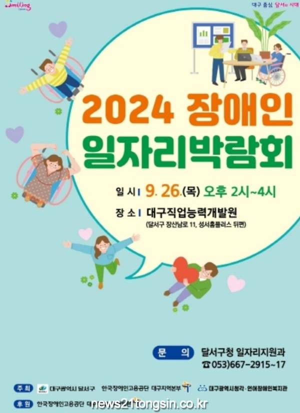 (뉴스21통신) 최우성기자 = 대구 달서구(구청장 이태훈)가 오는 26일 오후 2시부터 4시까지 대구직업능력개발원에서‘2024년 장애인 일자리박람회’를 개최한다.