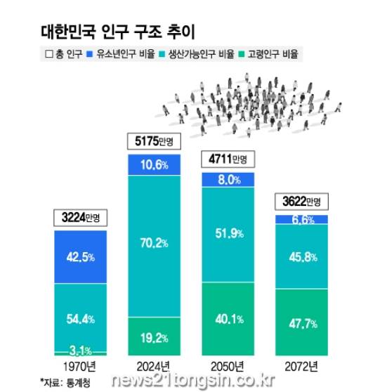 '노인의 나라'가 될 미래 한국은 환갑도 나이가 많은 축에 속하지 못하는 사회로 바뀐다. 올해 46.1세인 한국의 중위연령은 2072년 63.4세로 예상된다. 중위연령은 총인구를 연령 순서로 나열할 때 정중앙에 위치하는 사람의 연령이다. 1990년대만 하더라도 한국의 중위연령은 20대였다. 하지만 50년 후에는 환갑이 돼도 중위연령에 이르지 못한다.
