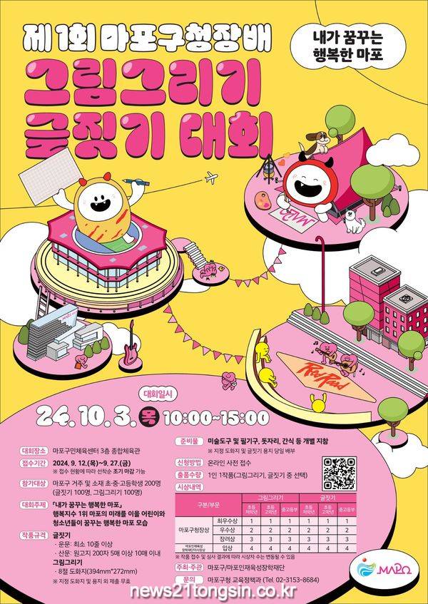 대회는 10월 3일(목요일) 마포구민체육센터 3층 종합체육관에서 열리며, 자신이 꿈꾸는 행복한 마포의 모습을 자유롭게 그림 또는 글로 표현하게 된다.