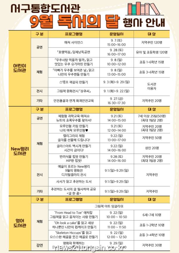 6개의 구립도서관에서는 총 57개의 프로그램(공연 6개, 강연 5개, 체험 20개, 전시 10개, 기타 행사 16개)을 준비하여 지역 주민들이 독서에 대한 즐거움을 발견하는 시간이 되길 기대하고 있다.