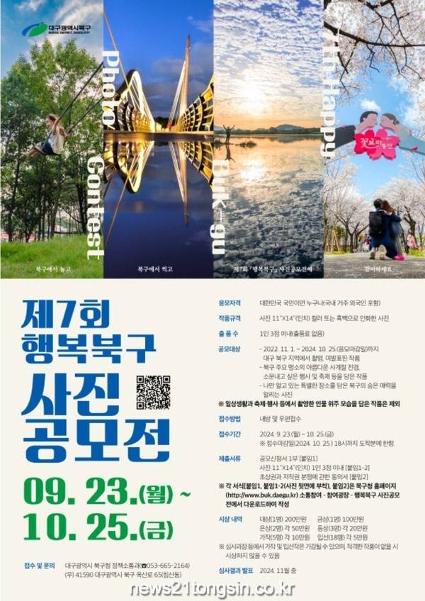 (뉴스21통신) 최우성기자 = 대구 북구청(청장 배광식)은 오는 9월 23일(월)부터 10월 25일(금)까지 전 국민을 대상으로 제7회『행복북구』사진 공모전을 개최한다고 밝혔다.