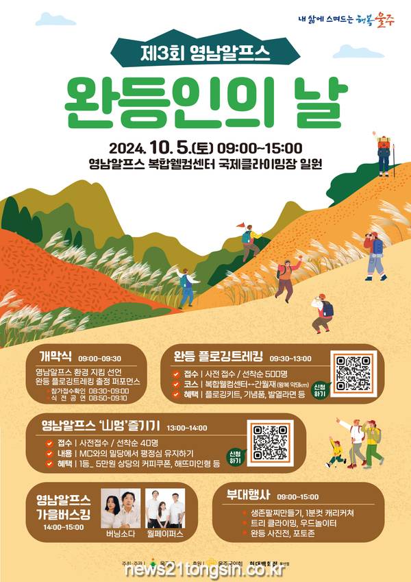 (뉴스21통신/우정석기자) = 울산시 울주군이 다음달 5일 영남알프스 복합웰컴센터에서 ‘제3회 영남알프스 완등인의 날’ 행사를 개최한다고 24일 밝혔다.