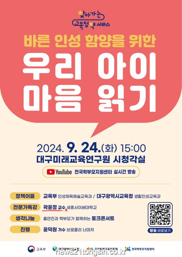 이어, 대구시교육청 이해연 과장, 교육부 김새봄 과장, 곽윤정 교수와 학부모가 함께하는 토크콘서트를 통해 부모님들이 자녀의 마음을 더 깊이 이해하고 학교와 함께 자녀를 올바른 방향으로 양육하기 위한 고민과 구체적인 해결방안에 대한 소통의 시간을 가진다.