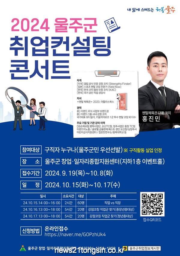 (뉴스21통신/우정석기자) = 울산시 울주군이 다음달 15일부터 17일까지 울주군 창업·일자리 종합지원센터 이벤트홀에서 ‘2024 울주군 취업컨설팅 콘서트’를 개최한다고 25일 밝혔다.